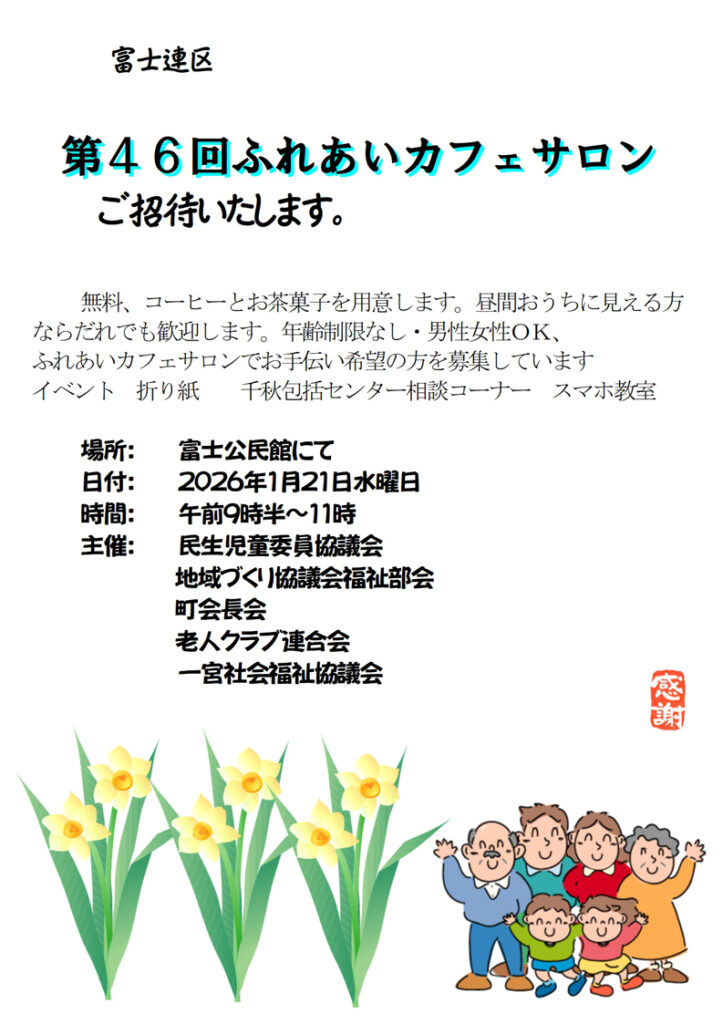 2025年12月8日 / 最終更新日時 : 2025年12月8日 hasebe138 福祉部会 【お知らせ】第46回ふれあいカフェサロン 1月21日(水)に開催しますFacebookXBlueskyCopy